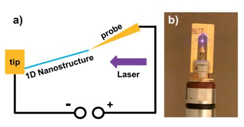 圖2:(a)原位透射電子顯微鏡光學-光電測量系統應用示意圖。(b)原位透射電子顯微鏡光學-光電測量樣品桿頭部實拍圖。