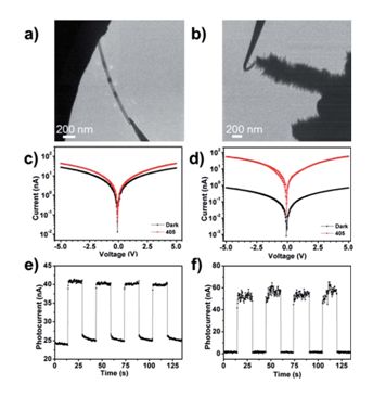 圖4:(a)(b)分別對應CdS納米帶和CdS/ZnO異質結安置在原位光學-光纖樣品桿中的TEM圖像。(c)(d)分別對應CdS納米帶和CdS/ZnO異質結I-V曲線的開關特性。(e)(f)分別對應CdS納米帶和CdS/ZnO異質結對周期性光信號的響應特性。