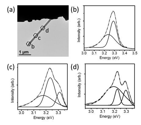 圖1:(a) 原位透射電子顯微鏡光學-光電測量系統應用原理圖;(b) 單根ZnO納米線的TEM圖像,電子束被聚焦在納米線的末端。(c) 圖解ZnO納米線的發光機制; (d) 典型的CL譜。
