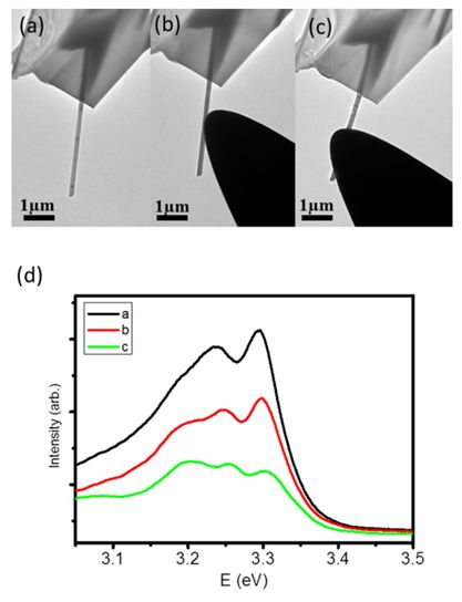 ZnO是一種重要的II-VI族半導體材料。它擁有高達60 meV的激子結合能,以及25 meV的熱激活能。ZnO納米線可以被用于制造導波管,納米激光器,光探測器,以及發光二尤管。在這些光學應用中,激子與縱向光學聲子(LO)之間的耦合特性一直是研究者們討論的重點。這種耦合特性往往與晶格結構以及應力產生的缺陷有關。結合澤攸科技原位透射電子顯微鏡光學-光電測量系統(ZepTools Technology Co., Ltd.),研究者在TEM中原位測量施加了不同應力ZnO納米線的陰尤發光譜(CL),揭示了該材料結構特性與這種耦合特性之間的聯系。相關研究成果發表在《APPLIED PHYSICS LETTERS》上。
